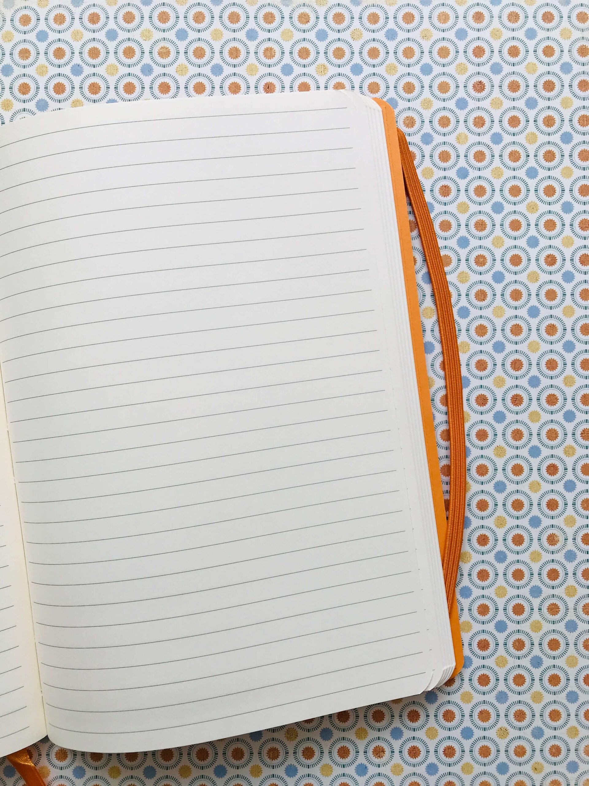 Wybrałam linie i najbardziej klasyczną, bo pomarańczową, okładkę. 160 lekko kremowych kartek, miękkawa oprawa (bardzo podobna do tej w Lamy, zarówno jak i w materiale obicia, jak i giętkości!) i zadruk w wysoką na 7 milimetrów, dość ciemną, linię. Do tego papier grubości 90 gsm, która, jak już wspomniałam, jest najwyższą wśród topowej trójki producentów.