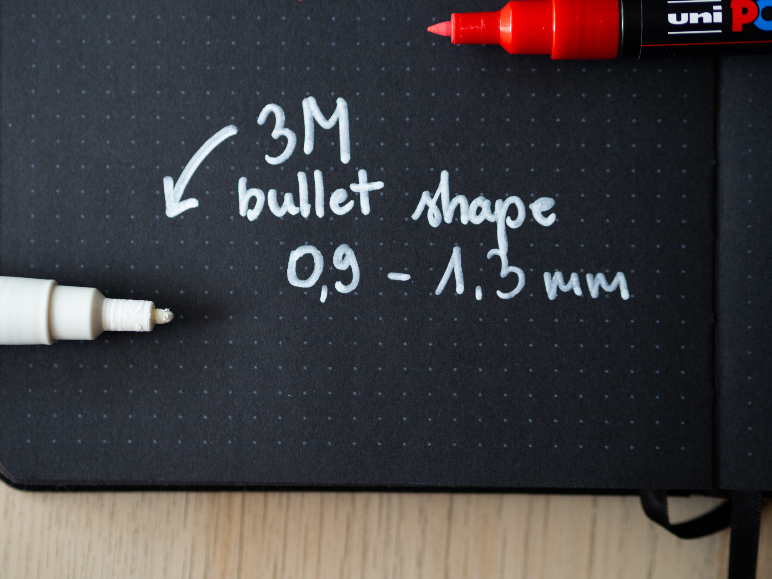 Uni POSCA dobrze radzi sobie również z ciemnym papierem. Rysując i pisząc po czarnym papierze o gramaturze 160 gsm nie zauważyłam żadnych wyjątkowych problemów. Tak, jak zapewnia producent, kolor powierzchni nie ma dla nich żadnego znaczenia.
